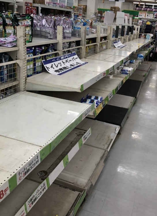 巷では根拠のない噂が広まり、ドラックストア、スーパーからトイレットペーパー姿を消し品薄な状態にあります。