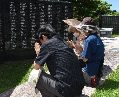 【平和の礎の前で手を合わせる遺族】 出典:https://ryukyushimpo.jp/news/entry-1143157.html