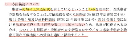 診療拒否は医師法19条1項に違反しますが、「厚生労働省新型コロナウイルス感染症対策推進本部」より3月11日に「各衛生主管部」へ送られたガイドラインにおいては以下の通りとなっています。