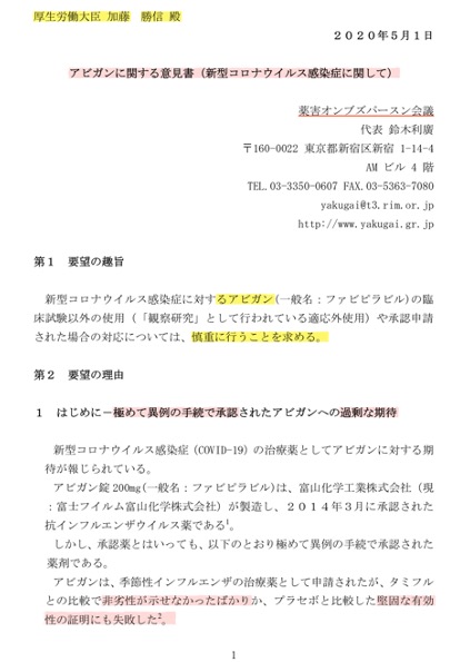 さらには、本来の目的である季節性インフルエンザにさえ統計的に有意差が見られないことから、薬害オンブスパースン会議は5月1日、厚生労働大臣宛てに「アビガンに関する意見書」を提出しました。