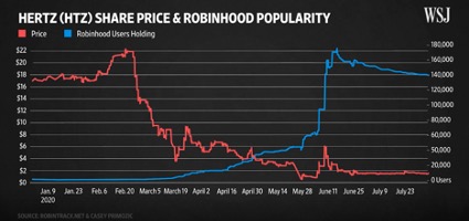 Wall Street Journal5月末には、破綻が確定しており、理論的に無価値で、1ドル未満で売買されていたHERTZ社株式が、ロビンフッダーの買いにより6ドルにまで急騰しました。