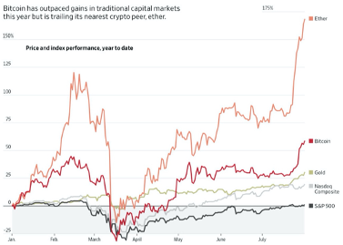 Wall Street Journal実態なき金融商品の象徴である仮想通貨も急騰を見せています。