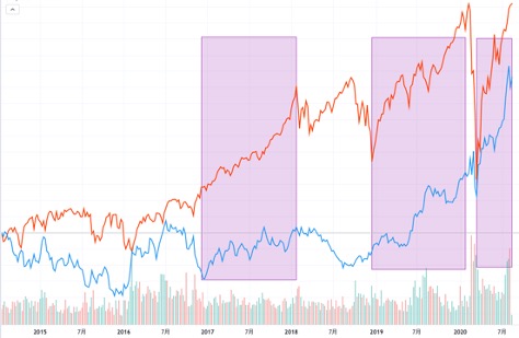 S&P500株指数(赤)とドル建て金価格(青)、3つのシャドーは株式と金の同時上昇期間