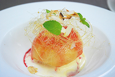 飴細工が施された冷たい桃の華麗なるデザートで、旅の始まりのひとときに彩を与えてくれるその高度な職人技には目を見張るものがあります。ティールームの窓から悠久のテムズ川の流れを眼下に見下ろし、明日目前に繰り広げられるはずの6月のイングランドならではの数々のドラマティックな光景を胸に思い描き、