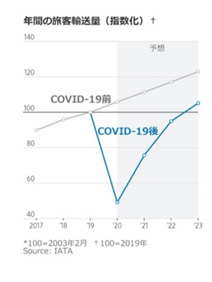 Wall Street Journal例えば、航空業界では、コロナ前の輸送量に戻るまで、約2年の年月が必要になりそうです。