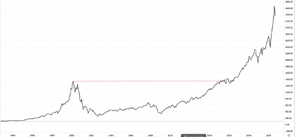 は2000年のハイテクバブルの高値を超えるまでに、10年以上の月日が経過しています。