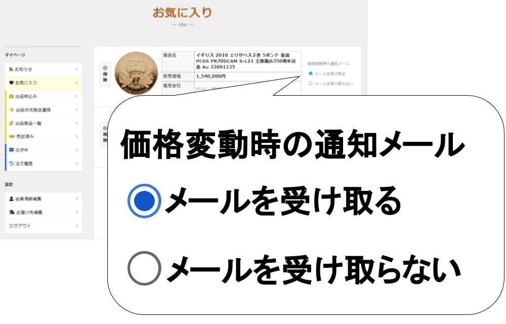 お気に入り登録されたコインは、マイページの「お気に入り」から、確認することができ再度同じコインを探す際の手間が大幅に減ります。