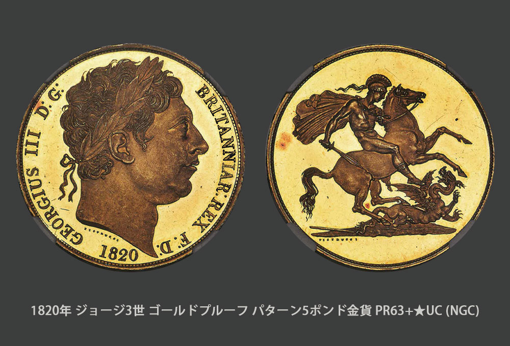 660,000ドルでの最終落札を果たしますが、これは同じく英国の1820年・ジョージ三世・ゴールドプルーフ・パターン5ポンド・PR63+★・ウルトラカメオ・NGCの504,000ドルの落札値を超越する記録となりました。