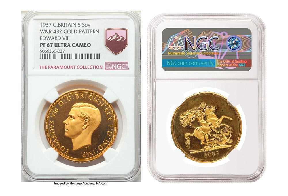 国別としては最大の収益として記録されています。その中でも単独でトップ・ロットの栄誉に輝いたのは、予想通り最高落札値2,280,000ドル(約2億5千万円)で取引された1937年・エドワード八世5ポンド・パターンコインで、