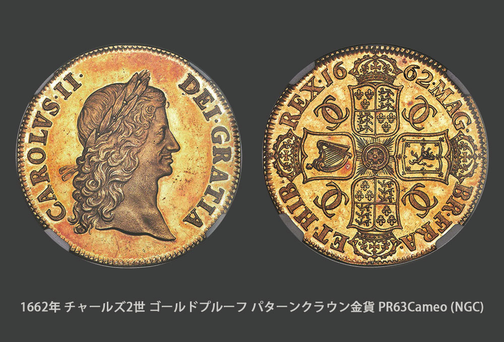 公開オークションで落札されたコインとしては史上最高額を更新しました。その他、高額落札された英国アンティーク・コインとして挙げられるのは、1662年・チャールズ二世・ゴールドプルーフ・パターンクラウン金貨・PR63・Cameo・NGCが780,000ドルで落札、