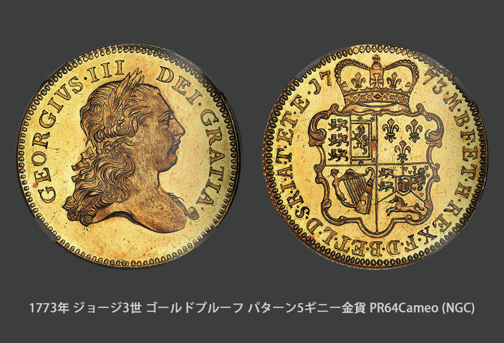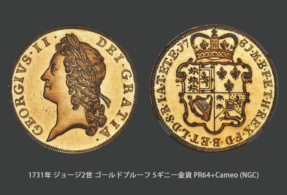 1773年・ジョージ三世・ゴールドプルーフ・パターン5ギニー金貨・PR64・カメオ・NGCが750,000ドルで落札、そして驚嘆に値する1731年・ジョージ二世・ゴールドプルーフ5ギニー金貨・PR64+・カメオ・NGCが21件の入札の結果、